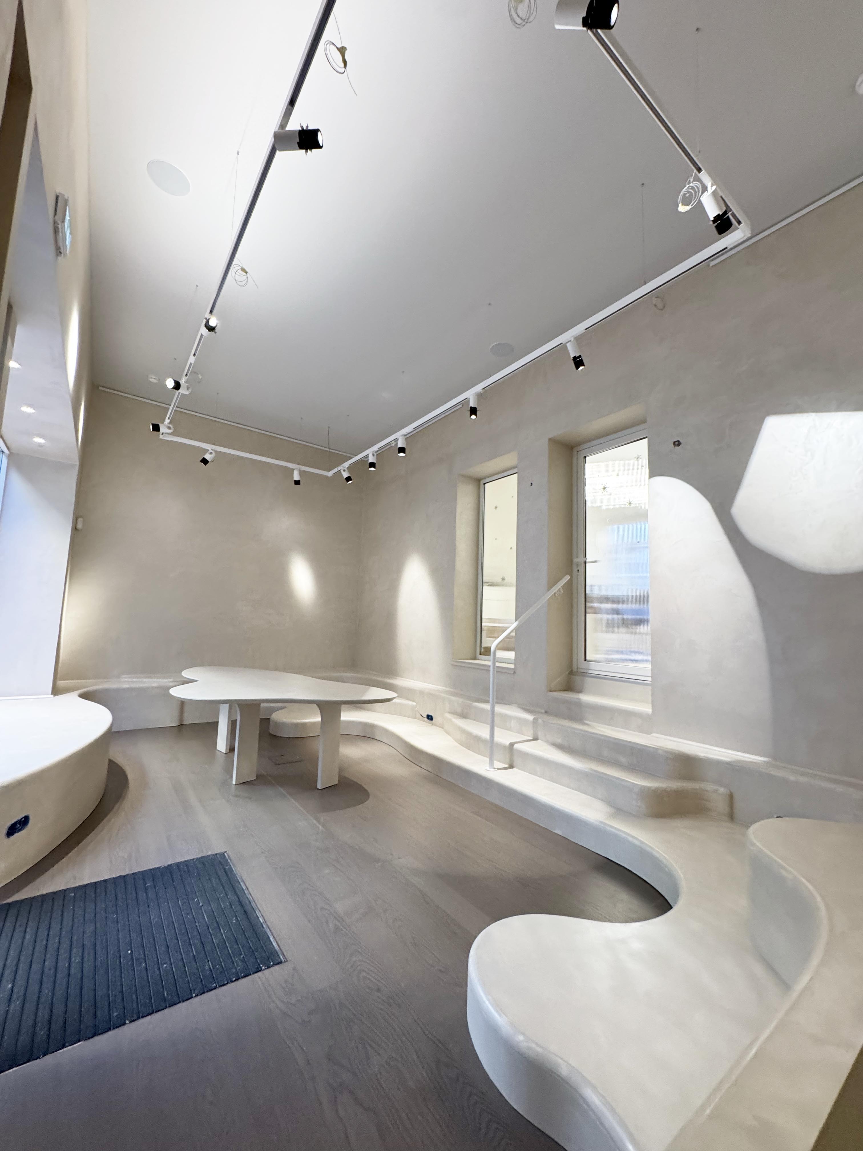 Réaménagement d'un espace d'exposition et de vente, avec des courbes organiques.